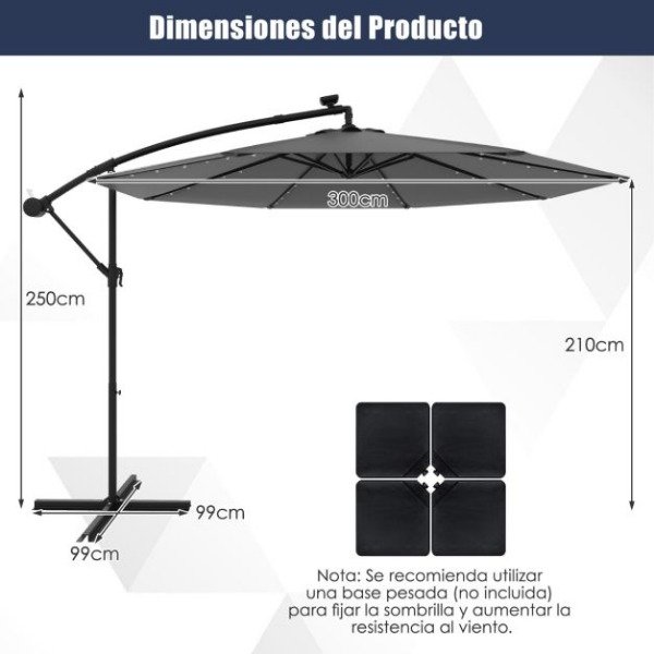 Disfrutá del aire libre con estilo con esta sombrilla colgante de 3 metros de diámetro. Su amplio toldo ofrece una gran cobertura de sombra, ideal para crear un rincón fresco junto a la pileta, en el jardín o en la terraza.